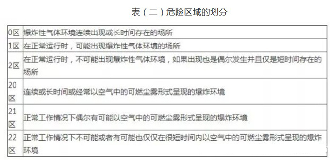 根據爆炸性環(huán)境的頻率和持續(xù)的時間把危險場所劃分為不同的區(qū)域。氣體場所劃分為三個區(qū)域:0區(qū),1區(qū)和2區(qū);粉塵場所分為三個區(qū)域:20區(qū),21區(qū)和22區(qū)。如表(二)所示: